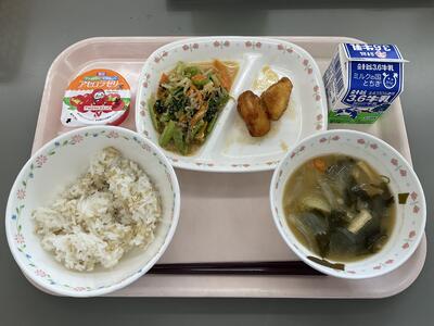 麦ごはん 牛乳 鶏のから揚げレモンソース ごまあえ みそ汁 アセロラゼリー