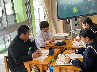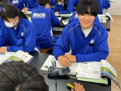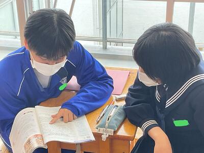 こちらは英語の授業です。ペア活動で、本文の内容を確認しています。