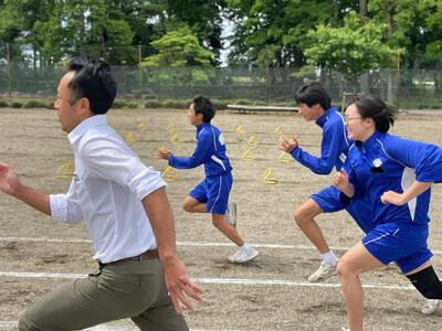 先生も一緒に走っています。シャトルランは大変な種目なんですよ。