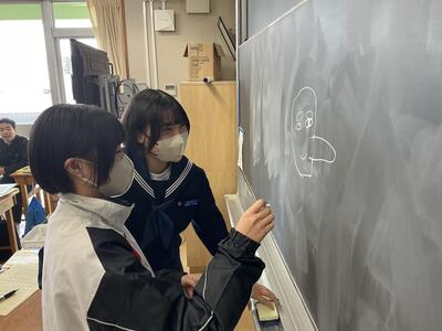 ちょっとじゃましちゃいました。さすが国語の先生!字が美しい。ん?絵が...。棒人間ですね。