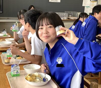 今日は誕生日の生徒がいるので、牛乳で乾杯です。