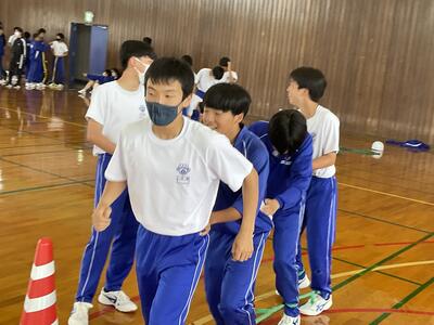 まずは気合が入る準備体操です。体育の先生の説明が迫力があります。