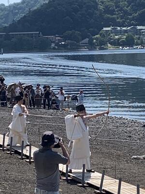 8月4日金曜日 日光市 中禅寺湖で扇の的弓道大会が行われています。甲冑武者や神職による演武が行われました。