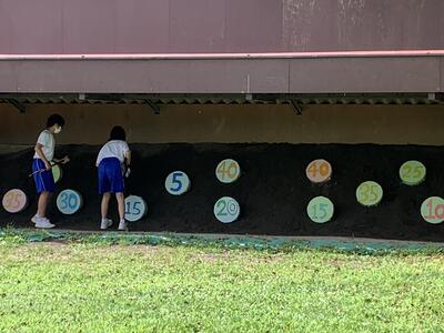 本日は3年生を送る会です。2年生が中心になって街の企画を行いました。いつもとは違って様々の点数の的があります。楽しいゲーム形式によるチーム戦です。