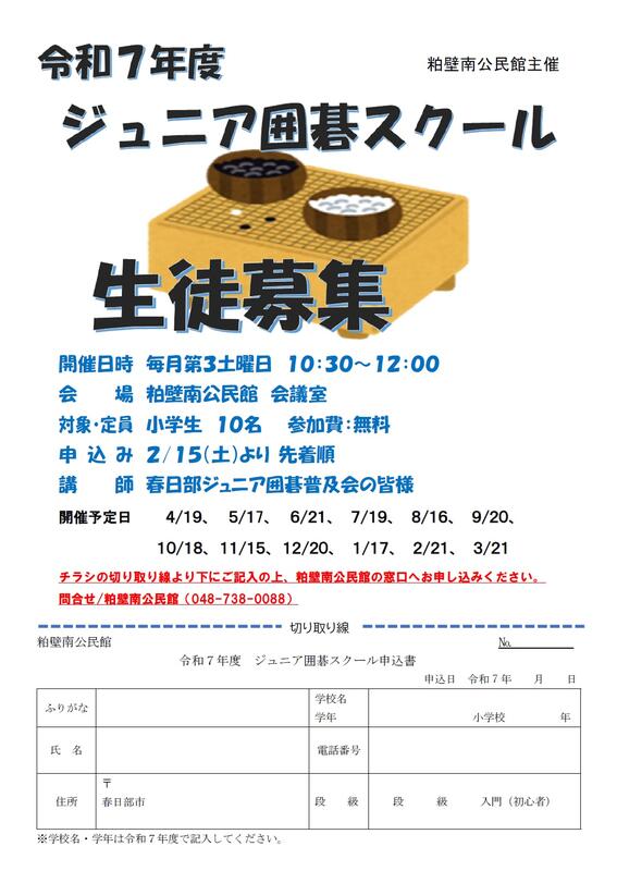 粕壁南公民館では、「ジュニア囲碁スクール」の生徒を募集しています!
