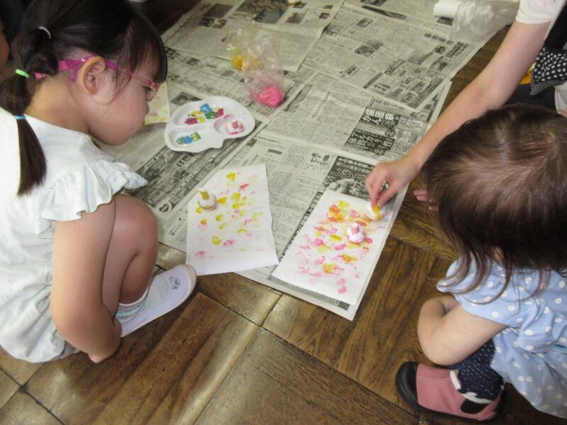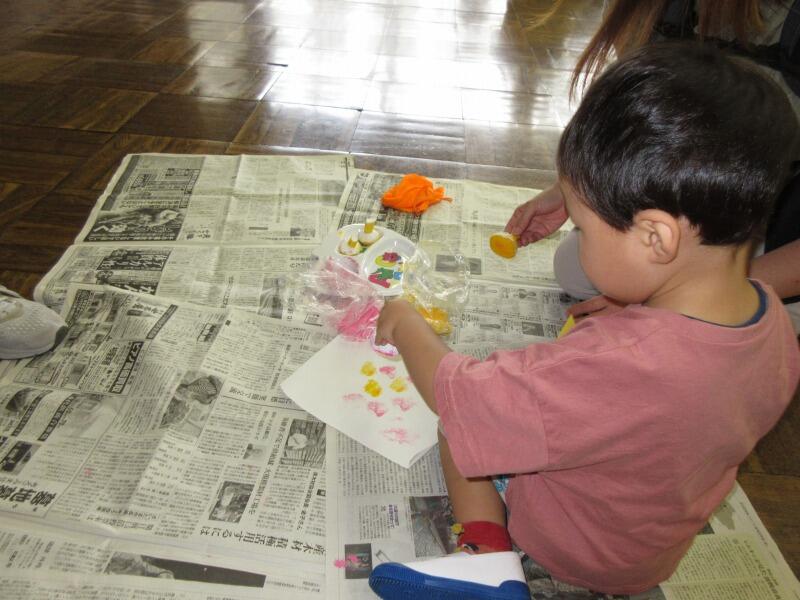室内に入ると、絵の具のついたタオルを白い紙にペッタンペッタン、好きな色をつけて乾かします。