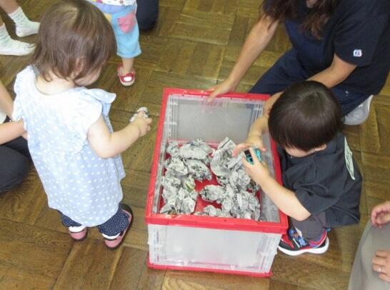 先ほど作った焼き芋をバルーンにのせて、みんなで1,2,3とかけ声に合わせて上下に振ると、なんと焼き芋が宙に浮かんだよー