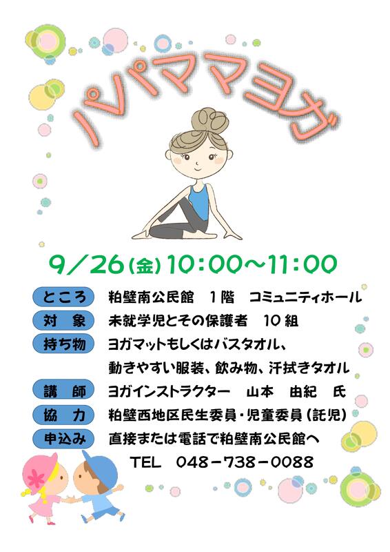 粕壁南公民館では、粕南パパママひろば「パパママヨガ」を開催しました。