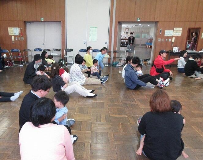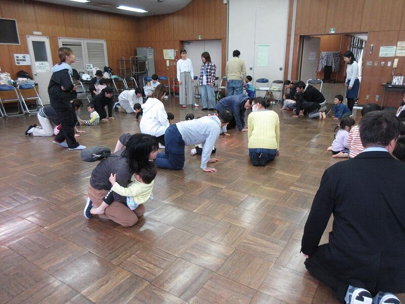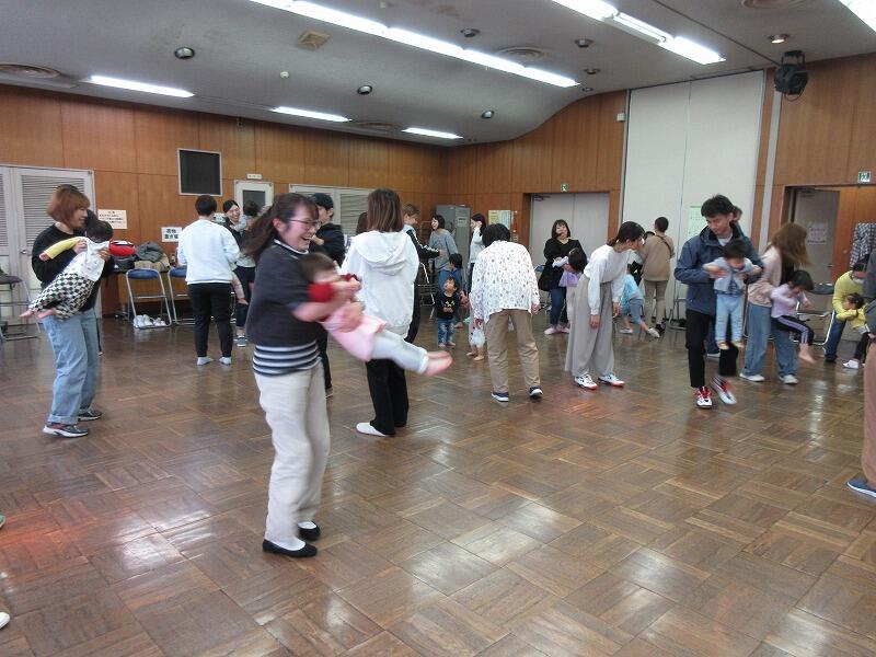 ゆらゆらさせたり、ぴょんぴょん跳ねさせたり、寝転がって腹筋をしたり、子どもは笑顔になり、お母さんには少しきついけれど、よい運動になりました