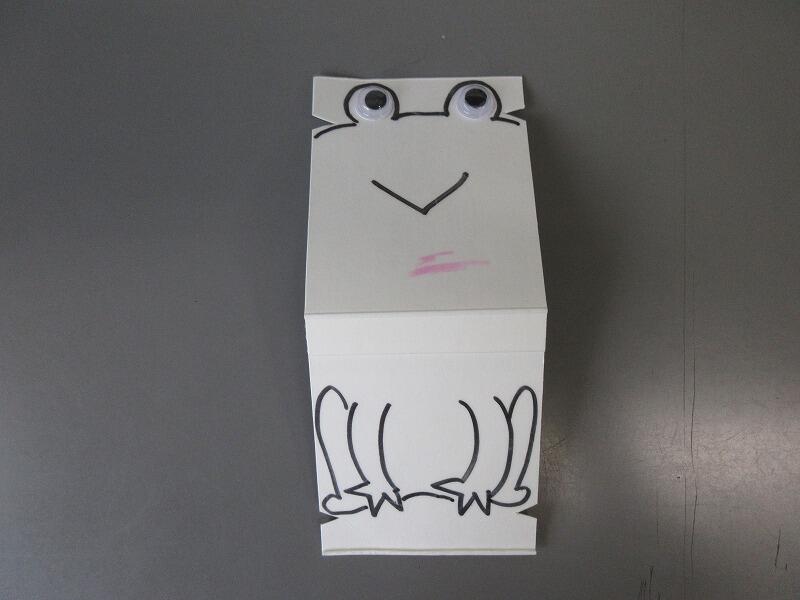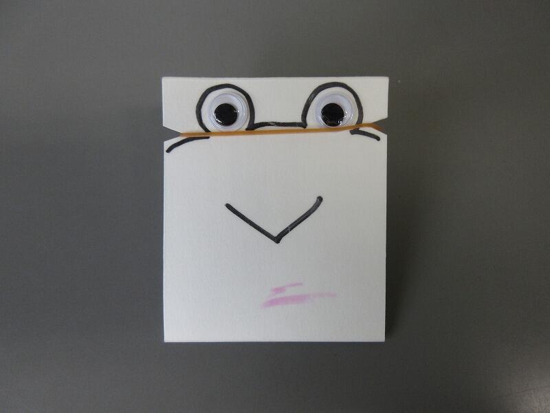 厚紙と輪ゴムで作ったもので、ぴょーんと跳ねる「ぱっちんカエル」です。動くおめめがかわいらしい