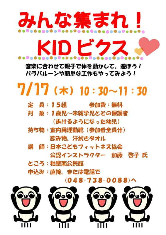 暑い日が続く中、粕壁南公民館に元気な子どもたちが集まりました。「みんな集まれ!親子ビクス」の開催です。