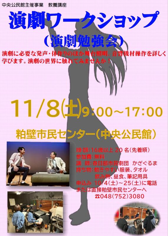 中央公民館で演劇を体験してみませんか?市内で活躍する劇団の皆さんが演劇の基礎を教えてくれます。初心者の方大歓迎です。現在申し込み受付中です。ぜひご参加ください!