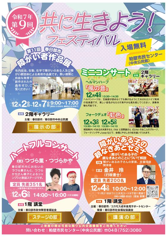 12月3日~9日の障害者週間に合わせて、粕壁市民センター(中央公民館)において、第9回共に生きよう!フェスティバルが開催されます。