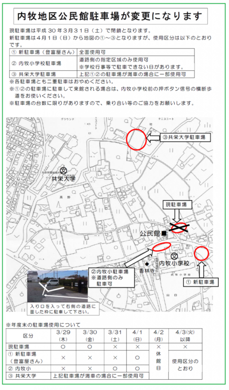 駐車場は、内牧市民センター(内牧公民館)の駐車場と香林寺の臨時駐車場(12/22のみ)ご利用下さい。