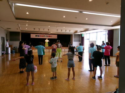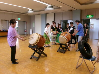 芸能の部は、フラカーネーション・フラワイキキ・フラココナッツの皆さんによるフラダンス、豊蓮会による日本舞踊、個人会員による和太鼓、豊野地区民踊連盟による民謡踊りの体験が行なわれました。
