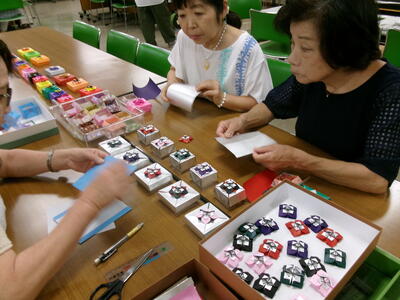 コマづくりは、慎重にえらんだ三色の折り紙が、あとで一つのコマとなってうまく組み合わさるように、それぞれ異なる形に折っていきます。講師の森脇美知代先生(豊野折り紙サークル)のていねいで温かみのある指導により、最初は戸惑い気味だった参加者の皆さんも徐々に慣れていき、2つ目、3つ目と次々と完成させていくことができました。