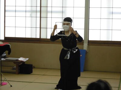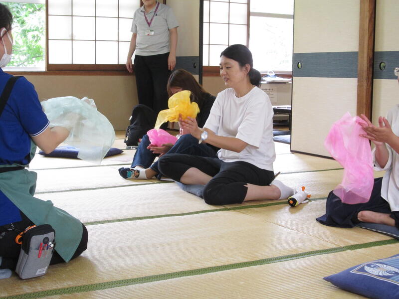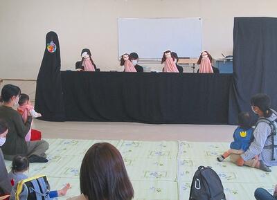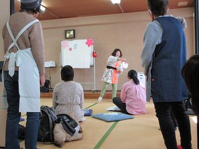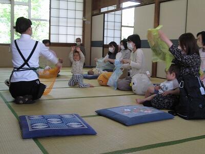 お話の後は、柔らかいシフォンを使って子どもたちとの触れ合い方を教えてくれます。シフォンは薄く透けて見える布なので、ママの顔が見えて安心できるそうです。
