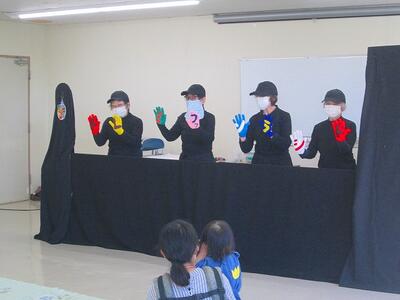先ずは、手袋の5本指にお人形を付けての手遊び。心地いい優しい声で始まります。