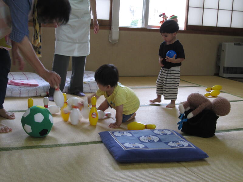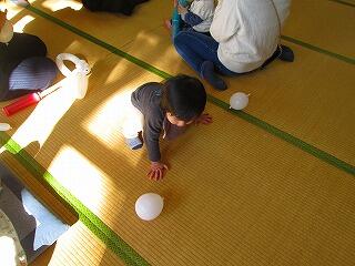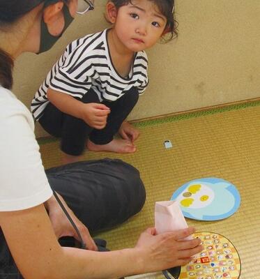 次は、「おっかけ玉入れ」黄色い「ひよこさん」、みどりの「カエルさん」の口にボールをポーン