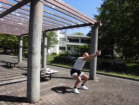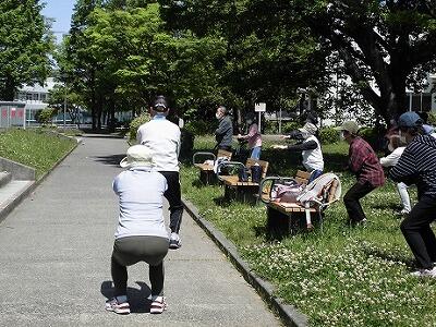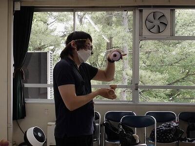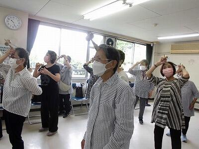 英語の音楽、先生の掛け声、ゼスチャーをまねして軽いウォーミングアップ