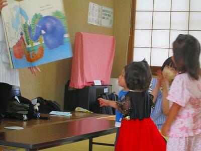 大きなカラフル絵本に子どもたちも真剣に見入り、聞き入っています。