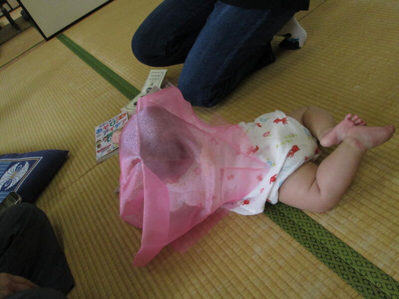 先ほどのシフォンを使って早速遊んでいます。赤ちゃんも手足バタバタ上機嫌!