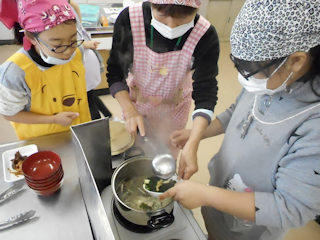 低学年も上手にお料理しています。お味噌の溶き方、洗い物の仕方もとても上手でした。