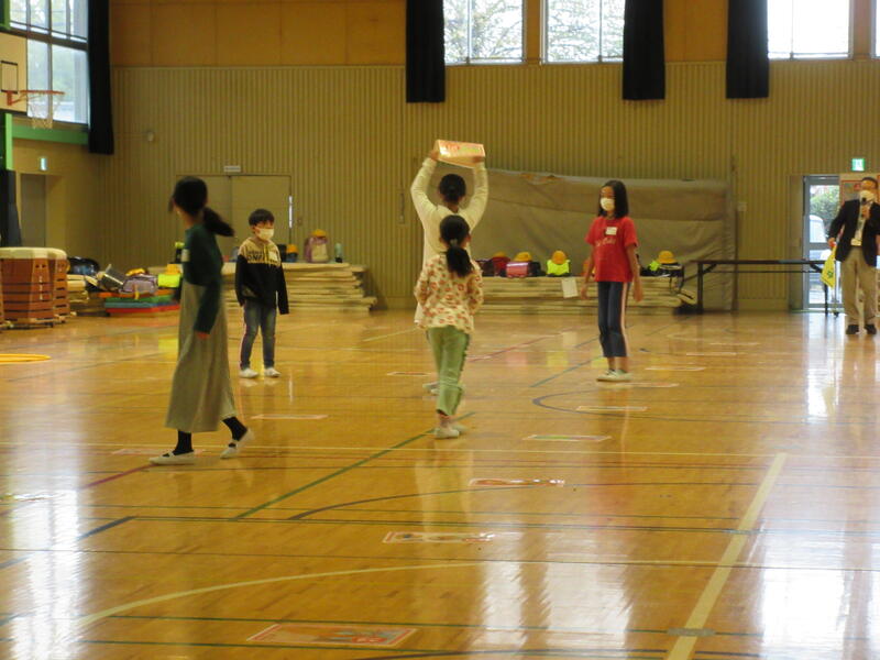 10チームに分かれて障害物リレーです。フラフープを回したり、ボールを運んだり、二人一組で背中合わせで走ったりしてゴールを目指しました。勢い余って転んでしまっても、元気にまた走り出します。つられてボランティアスタッフの大人も、一生懸命走りました。