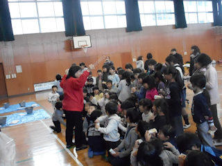 今回は、「チクサクコール」の練習から始まり、「指折り」→「肩たたきチャンピオン」→「だるまさん」→「ナンバーコール」→「サケとサメ」→「グー・チョキ・パー」→「リスと木」→「みんな集まれ」→「民族の大移動」→「集団じゃんけん」→「猛獣狩りに行こうよ」→「ジャンケン列車」→「お誕生日なかま(レクダンス)」→「チクサクコール」の順番で進みました。