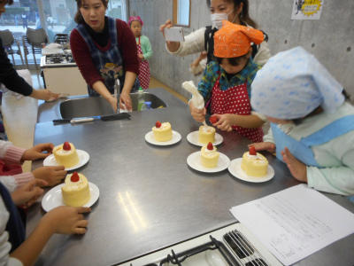 12月22日(火)、ハーモニー春日部を使って、ロールケーキ作りをしました。まず、卵や小麦粉、バター等を使って生地つくりです。あわ立て加減が難しいようです。次に、ホイップクリームをつくります。最後に焼きあがった生地に、フルーツをのせ巻きます。出来上がったロールケーキを包丁で切り、皆でいただきました。スタッフや保護者の皆様のお陰で、一足早いクリスマスケーキをいただくことができました。