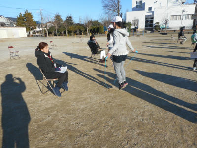 校庭で種目別のなわとび練習と記録測定を行いました。