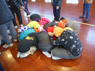 全員で大きな輪を作り、大人忍者の言った質問に当てはまる人は、真ん中に