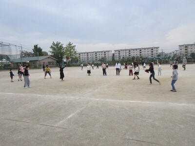 まずは準備運動をしてから、しっぽ取りゲームを行いました。高学年の児童からは「1年生のタグを取ってもいいのかと気を使いながら楽しみました。」という感想をもらいました。高学年が低学年に気を使うという優しさを学べるのも放課後子ども教室のいいところですね。