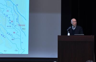 講座では、映像の解説をかねて、映像②の国による大規模河川改修工事、映像①で紹介されていた水防活動を対照に位置づけながら、春日部の水害と水防の歴史、その歴史から私たちが水害に備え、考えることについてお話させていただきました。
