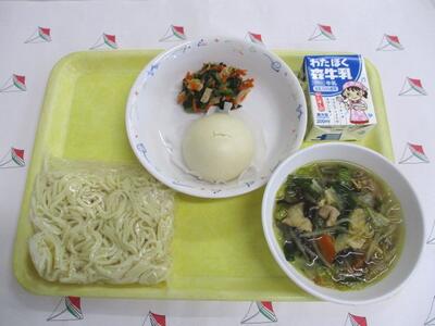 給食だよりにも書きましたが、麺が給食に登場したのは1960年代です。給食メニューのバリエーションを増やすために「ソフトスパゲッティ式めん」通称ソフト麺が開発されました。東京都の学校給食で採用されたものが各地に広がりました。今ではソフト麺もありますが、料理に合わせて「地粉うどん」と「ホット中華麺」を使用しています。