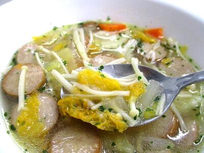 オレンジクインは、外側は普通の白菜と同じ白い茎と緑色の葉ですが、内側はオレンジ色の葉なので、スープに入っていると(写真だとわかりにくいですが)ミカンのような色に見えます。