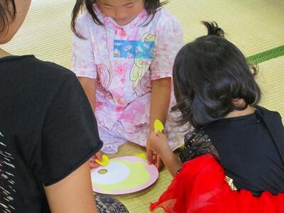 次に、「ペンギンさんのうちわづくり」一生懸命にシールを貼りました