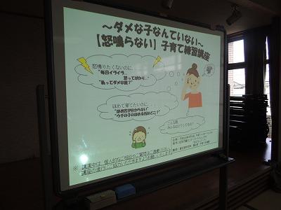 この講座は、子育て支援課の講義のもと、怒鳴らない子育て練習法における援助法を学びました。プロジェクターを使いながらわかりやすく説明していただきました。