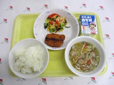 今日は中学校が卒業式のため、小学校だけの給食です。おかずがすべて小学校の量なので写真はいつもより少し少なめです。