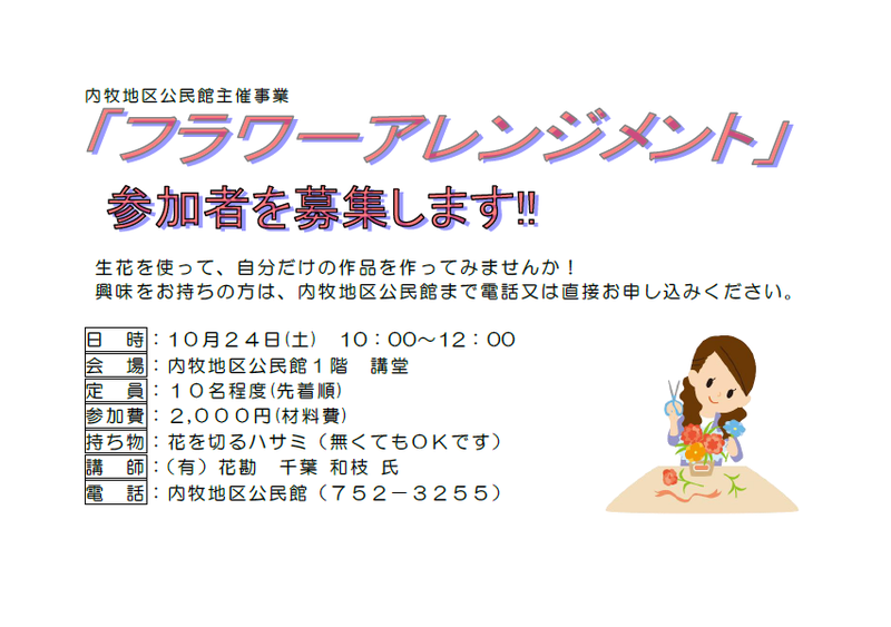 申込み:10月10日(土) 午前8時30分より電話または直接、内牧地区公民館へ。