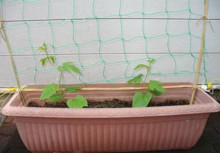 土作りを終え、さあ植えようかと見ますと、苗が届いてすぐの頃よりツルが伸びて「どこかつかませてくれー」と言っているようでした。