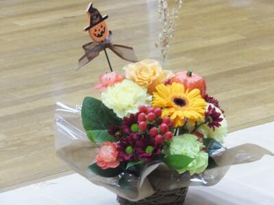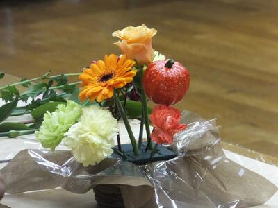 ハロウィンが1週間後なので、オレンジ色を中心とした花を使用して、参加者のみなさんが創作活動を行いました。