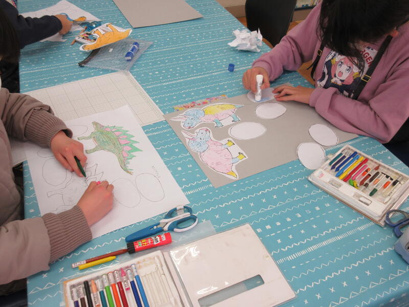 見本をみながら、丁寧に恐竜に色をぬっていきます。