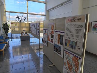 展示は、図書館入口手前にある談話コーナーで行われています。