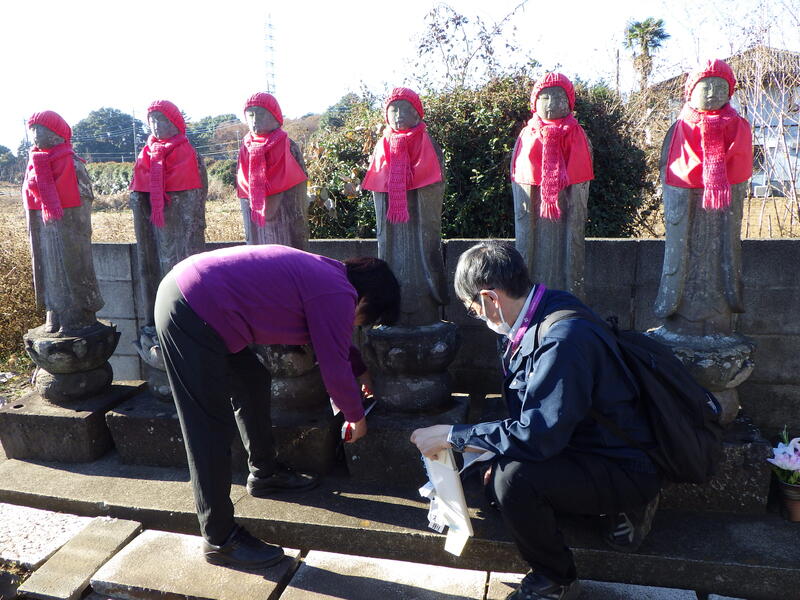 記念すべき第1回目の調査の対象地点は、原新田浅間神社と路傍にある六地蔵です。当日は、神社を管理されている地区の方々も立ち会ってくださり、拝殿なども見せていただきました。