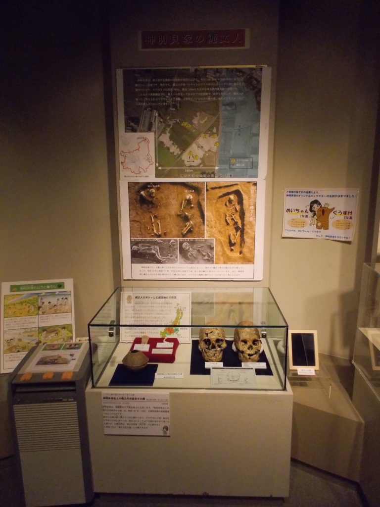 このコーナーでは、神明貝塚で出土した縄文時代の人の頭骨と、坊荒句遺跡で出土した江戸時代の人の頭骨を並べて展示しています。