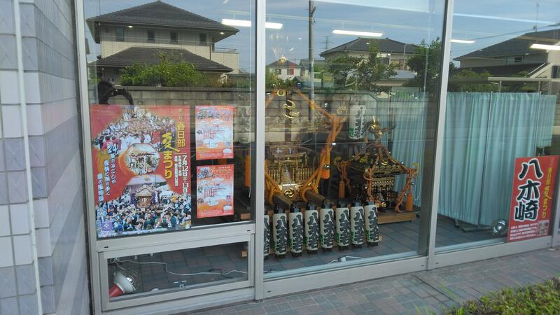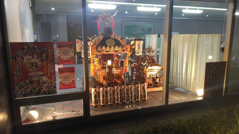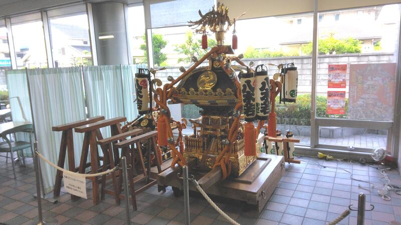 中央公民館ロビーの一角に、夏祭りまでの間、八木崎町会のお神輿を展示しています。