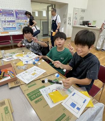 小さなモーターと単三電池一つで動く車を作るワークショップには、幼児~小学生45名の参加がありました。難しいところは、講師やおもちゃの病院のドクターたちに手伝ってもらいながら作りました。