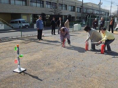 正風館内での火災を想定した屋外避難と消防署職員による消火器の説明、水消火器を使用しての消火訓練を行いました。