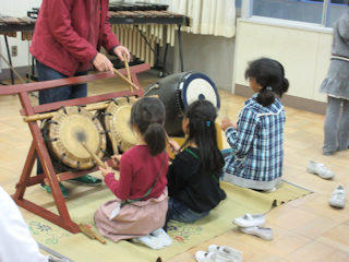 一生懸命ながら楽しそうに太鼓をたたく子ども達と、それを優しく見守って下さっている講師のみなさん、